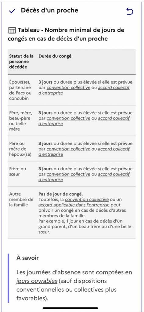 Vous êtes salarié et souhaitez savoir si vous pouvez obtenir un congé en cas de décès d’un proche ? Oui, vous pouvez obtenir des jours de congés en cas de décès d’un membre de votre famille : enfant, époux(se), partenaire de Pacs, concubin, parent. La durée du congé varie selon le lien de parenté avec la personne décédée. Nous vous présentons les informations à connaître (source : https://www.service-public.fr/particuliers/vosdroits/F2278).