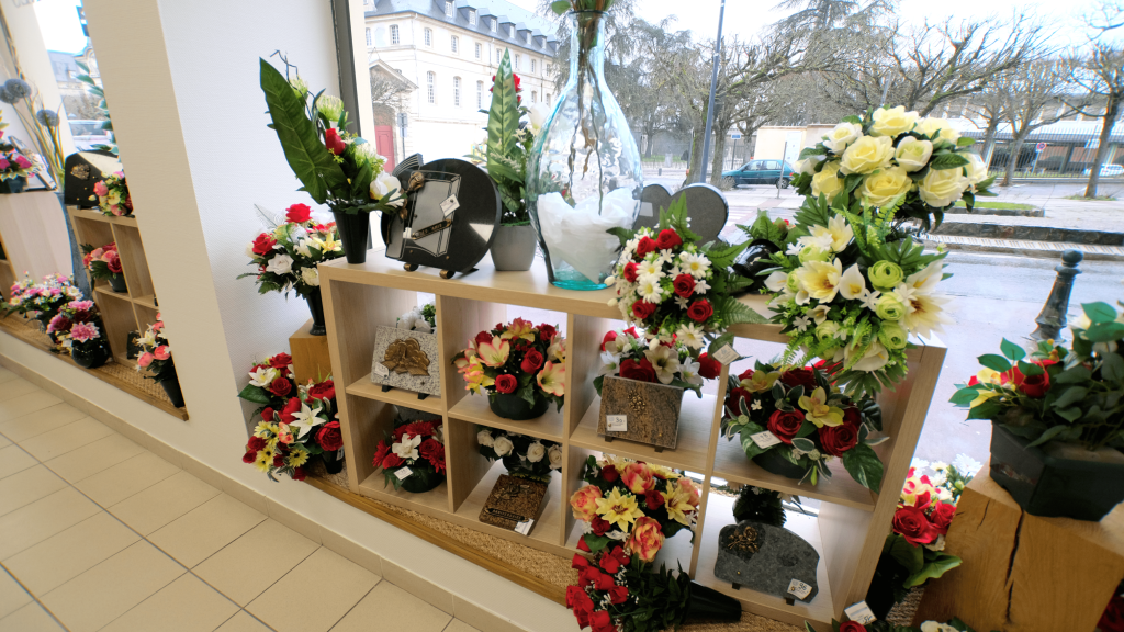 • les articles : cercueil, capiton, urne, fleurs, plaques;
