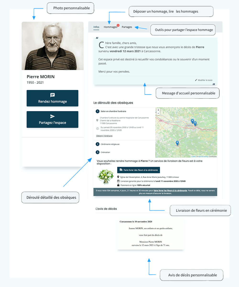 Vos proches peuvent témoigner leur soutien en déposant des messages de condoléances et des photos. Vous pouvez interagir en remerciant vos proches et en répondant aux messages. Il est possible d’accéder à cet espace sans aucune limite de temps et de faire imprimer sur un livre tous les hommages déposés.